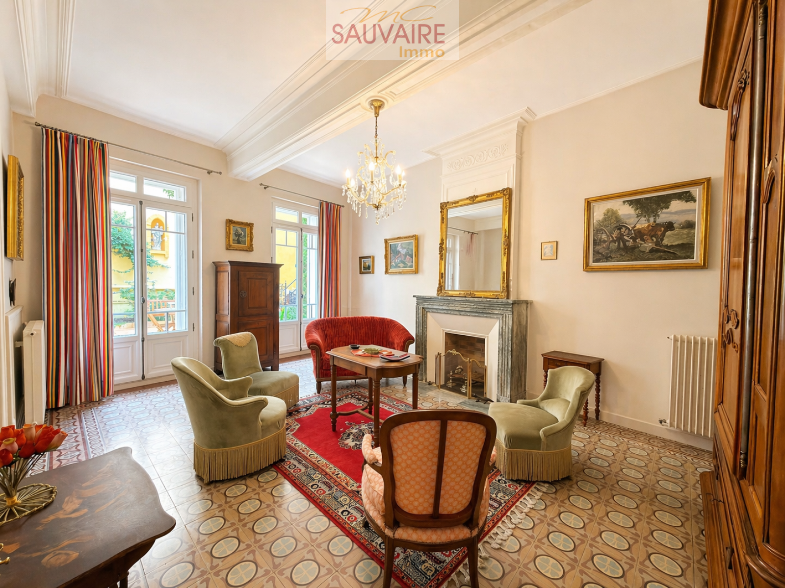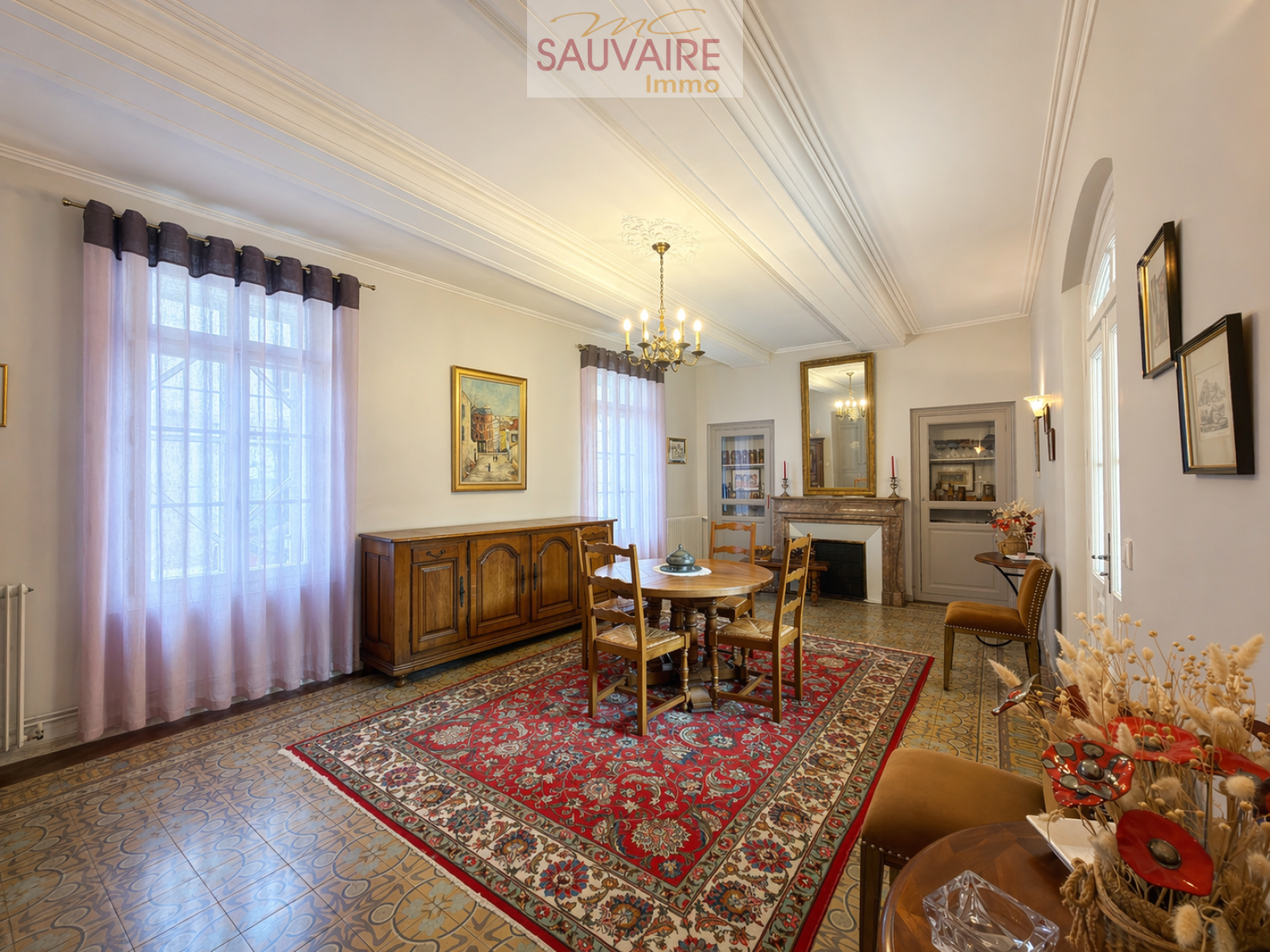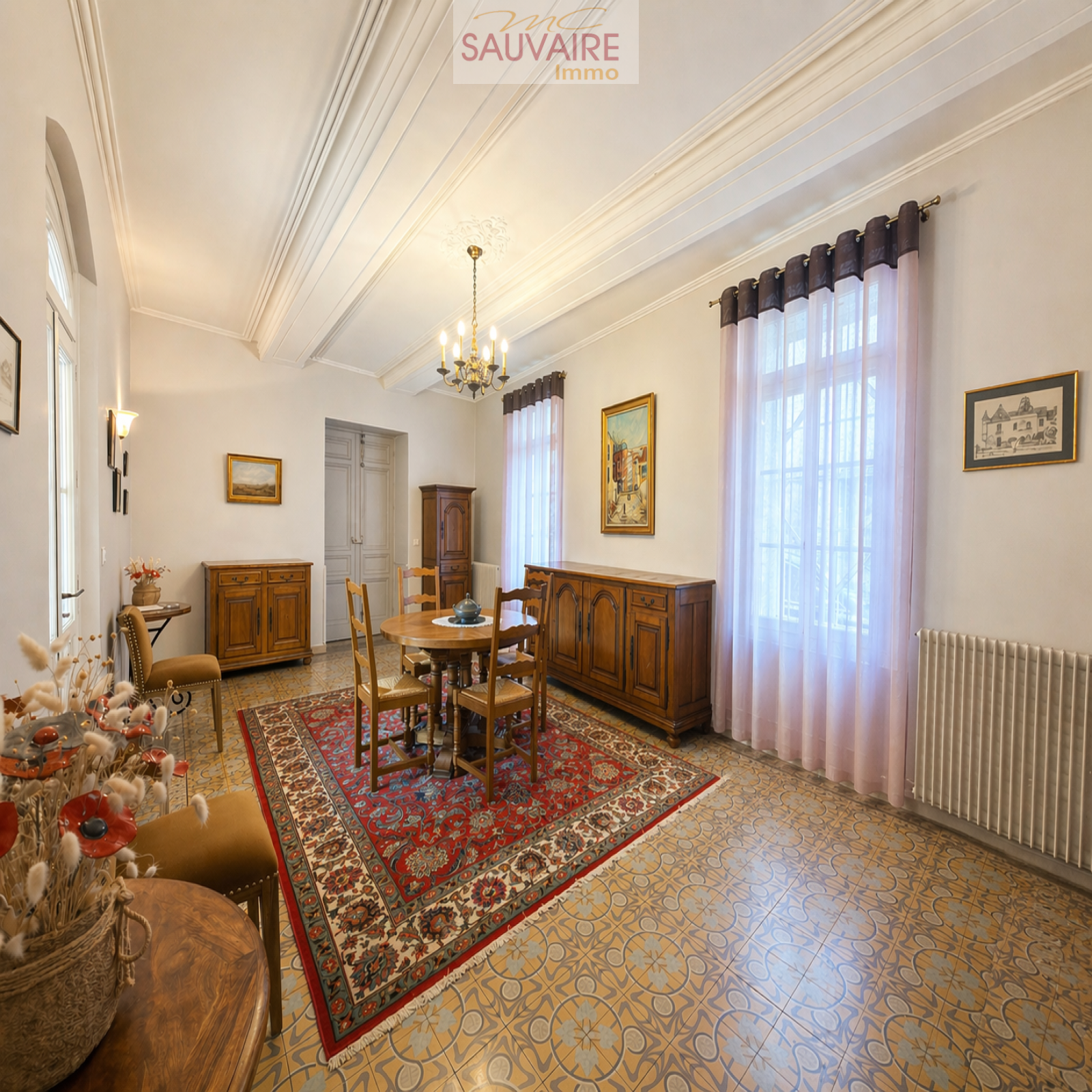 Dès l'entrée, le charme opère : volumes remarquables, carreaux de ciment d’époque, moulures raffinées et belle hauteur sous plafond composent une une atmosphère accueillante et élégante. Le rez-de-chaussée s’organise autour d’une vaste entrée desservant une belle salle à manger, un salon lumineux, une cuisine indépendante entièrement équipée, ainsi que des toilettes avec lave-mains.