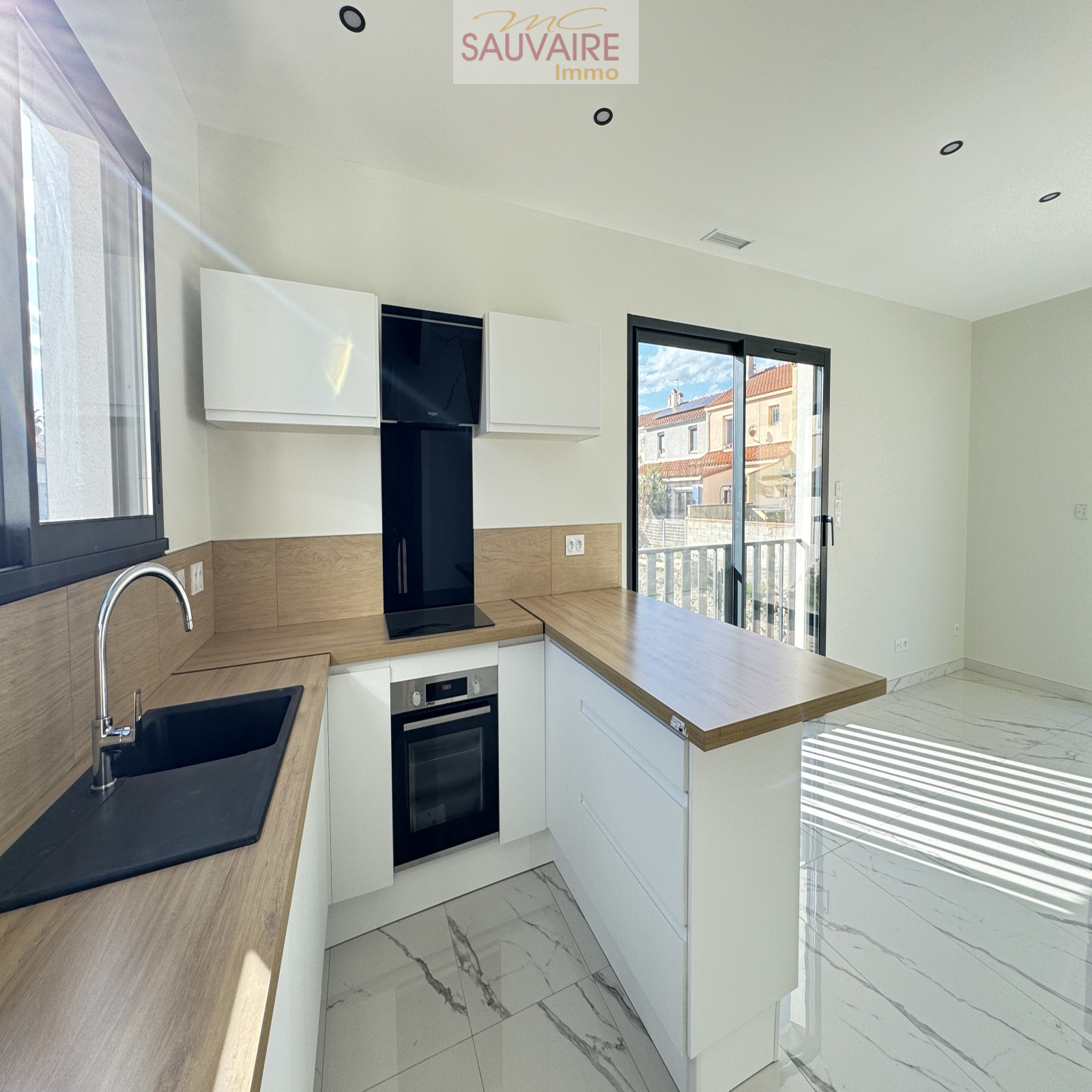 La villa se compose d'une entrée ouvrant sur un séjour lumineux avec cuisine américaine équipée. Elle offre deux chambres d'environ 11 m² chacune, une suite parentale avec salle d'eau privative, un WC indépendant, et une salle d'eau supplémentaire dotée d'une douche à l'italienne.